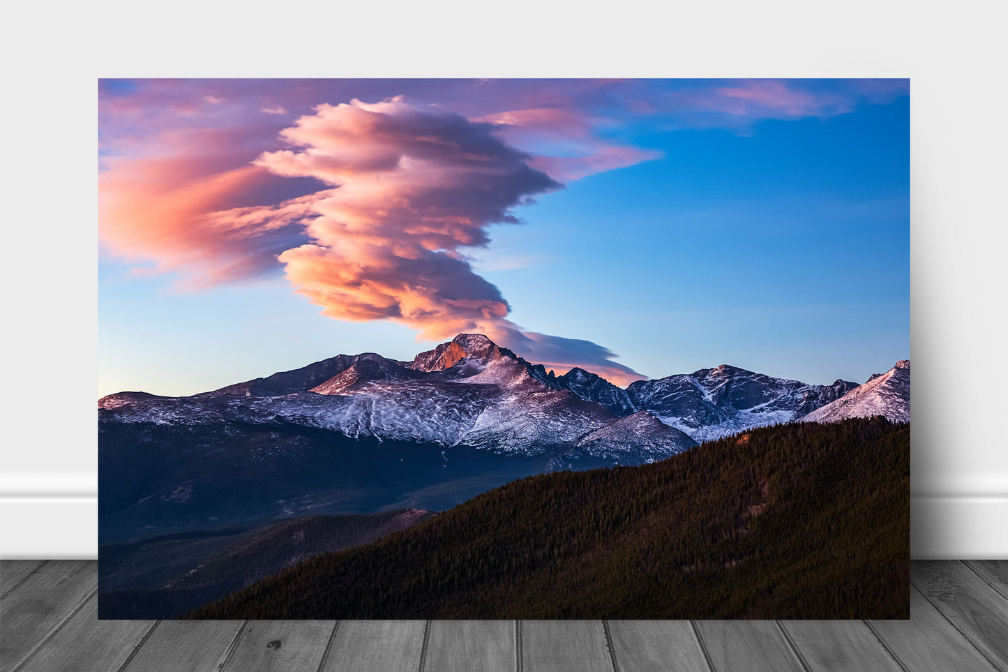 Title: Fire on the Mountain. A cloud rises above Longs Peak at sunrise in Rocky Mountain National Park, Colorado.
